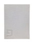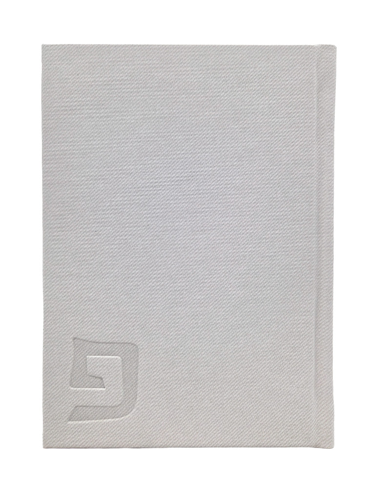 White leatherette textured cover with an embossed inittial on the front left handed corner
